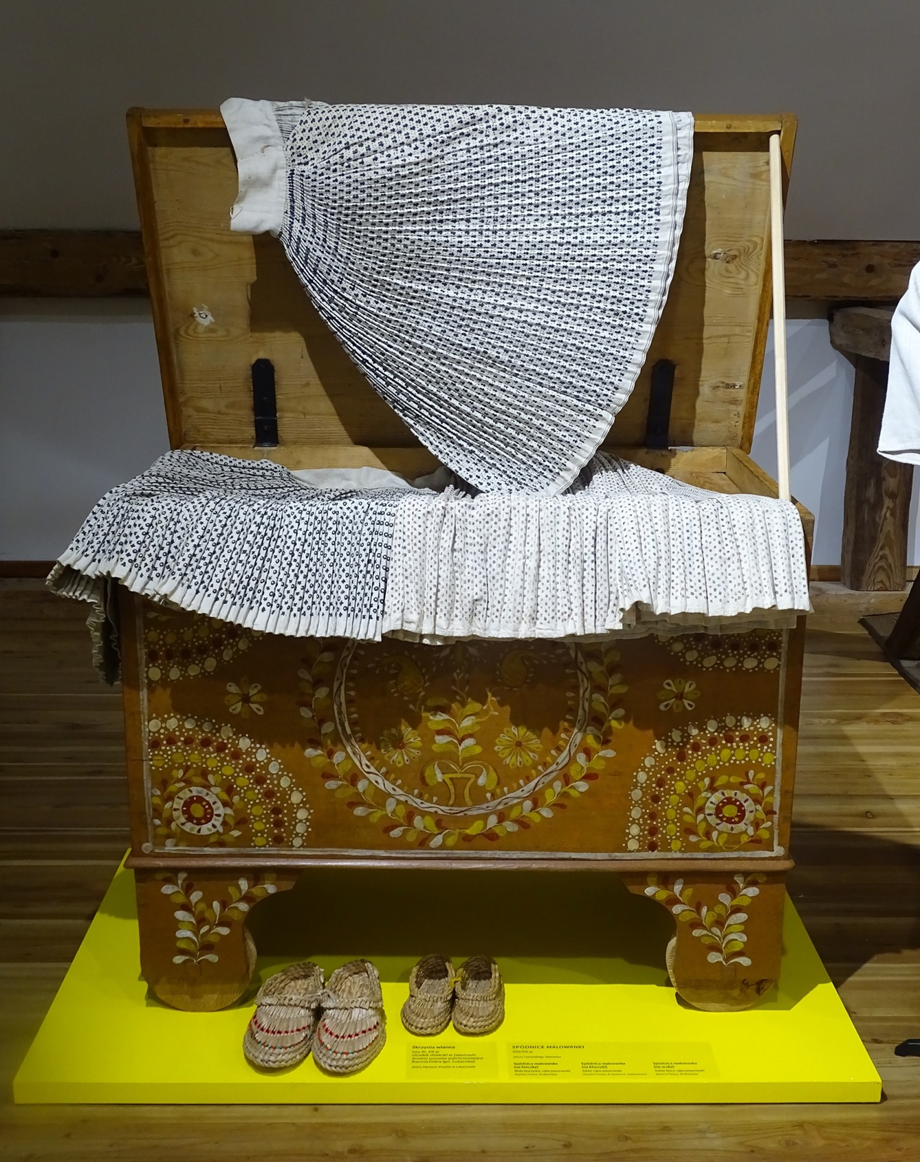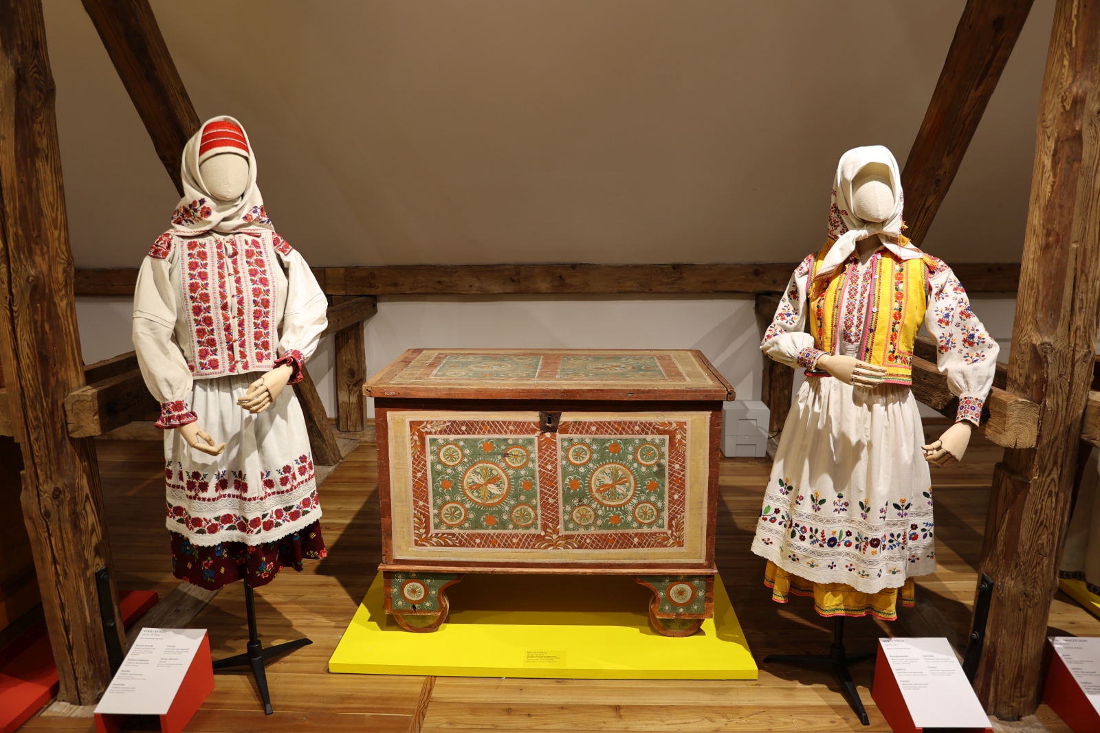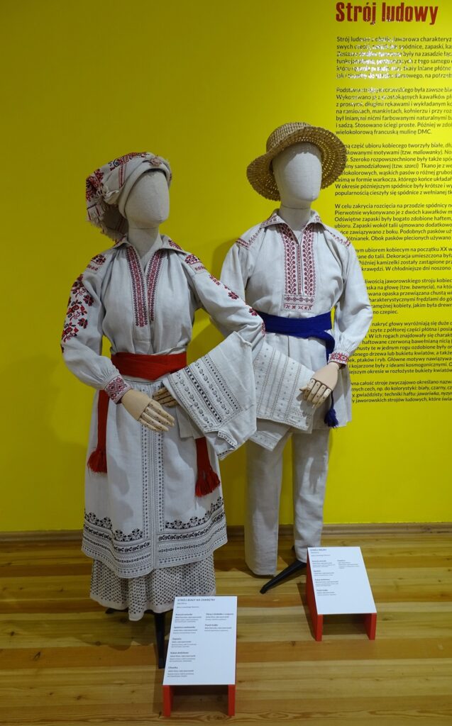 W malowanych skrzyniach przechowywane była odświętna odzież. Na wystawie zaprezentowano prawie sto elementów odzieży kobiecej i męskiej ze zbiorów lwowskiego Skansenu. Reprezentują one przemiany stroju jaworowskiego od końca XIX do połowy XX w. Do najstarszych należą obszerne, haftowane chusty kobiece (tzw. „ubrusy”), drukowane spódnice (tzw. „malowanky”), czy koszule (tzw. „soroczki”) zdobione motywami spiralnymi („na zakretky”). Specyficznym elementem stroju jaworowskiego była również opaska na głowę (tzw. „bawnycia”), na której kobiety zamężne wiązały chustę. Ewolucja stroju ludowego w okolicach Jaworowa polegała na stopniowym wprowadzaniu materiałów fabrycznych. Koszule, kamizelki, kabaty i zapaski nadal jednak zdobione były bogatymi haftami w różnych technikach, które pozostały do dziś charakterystycznym elementem ukraińskiego stroju ludowego.