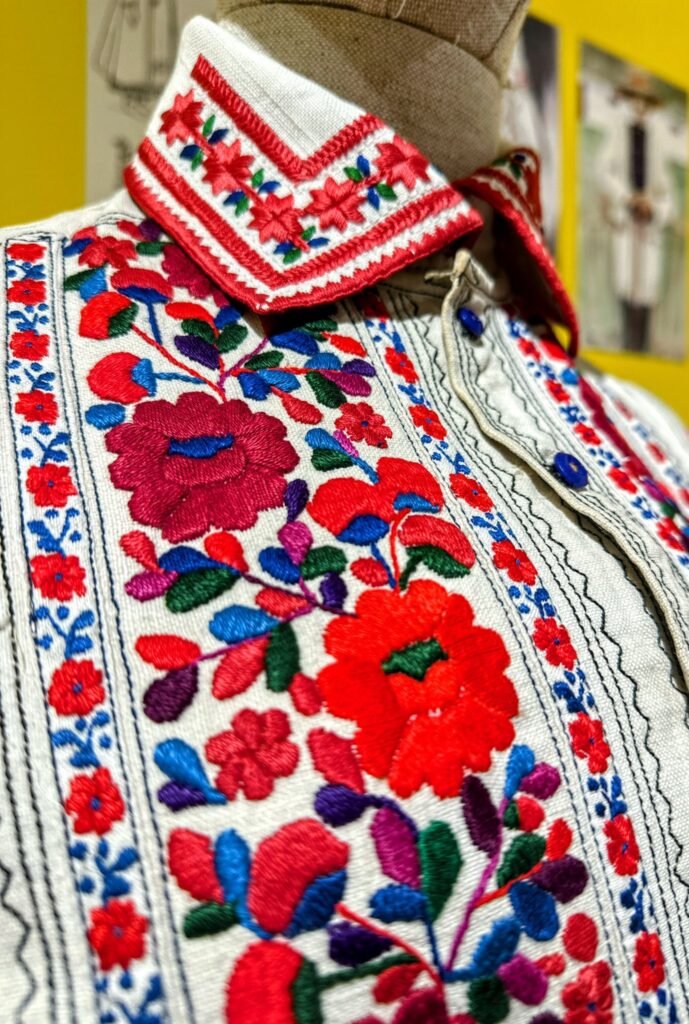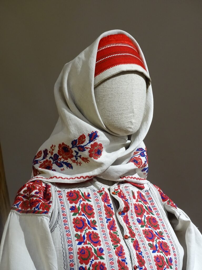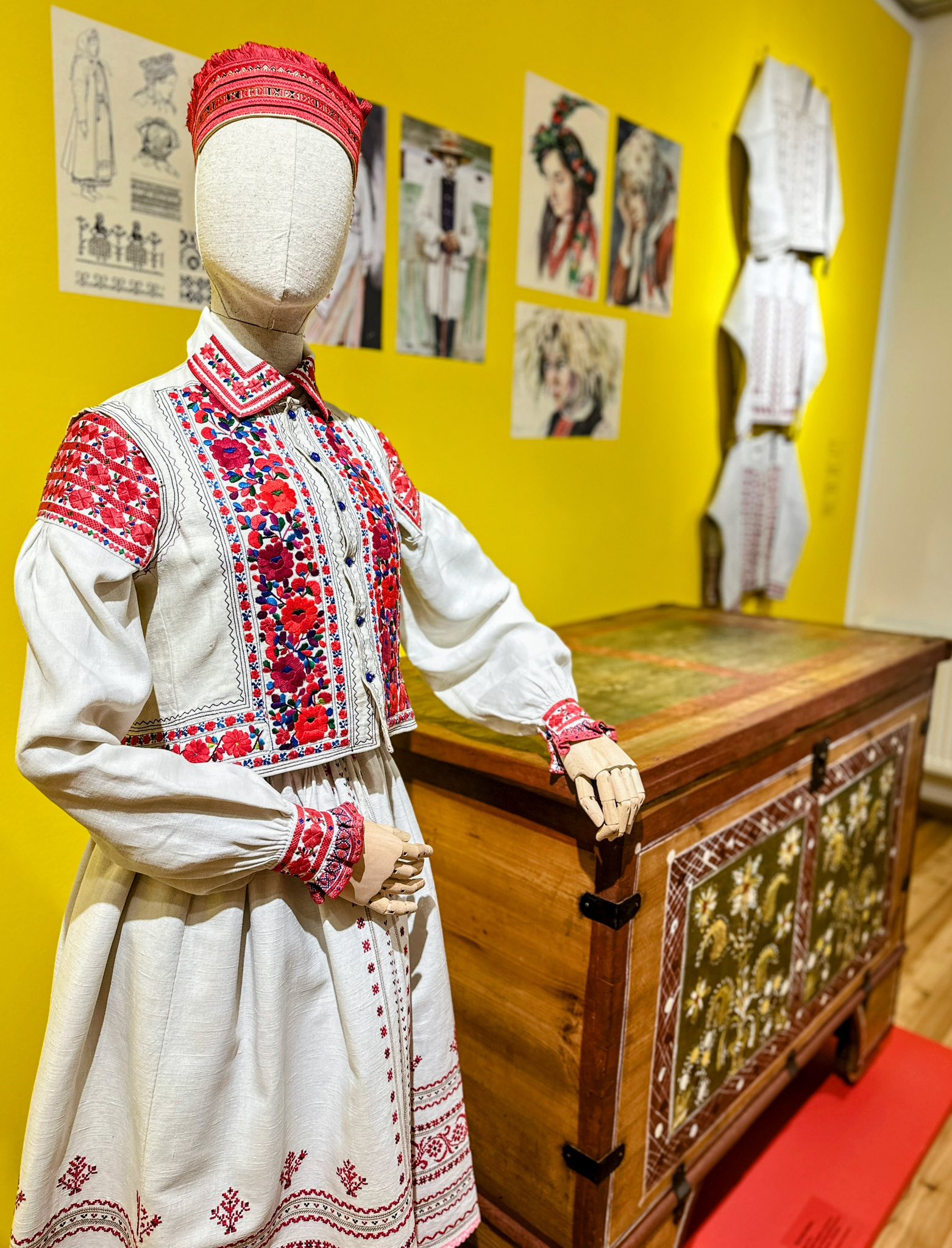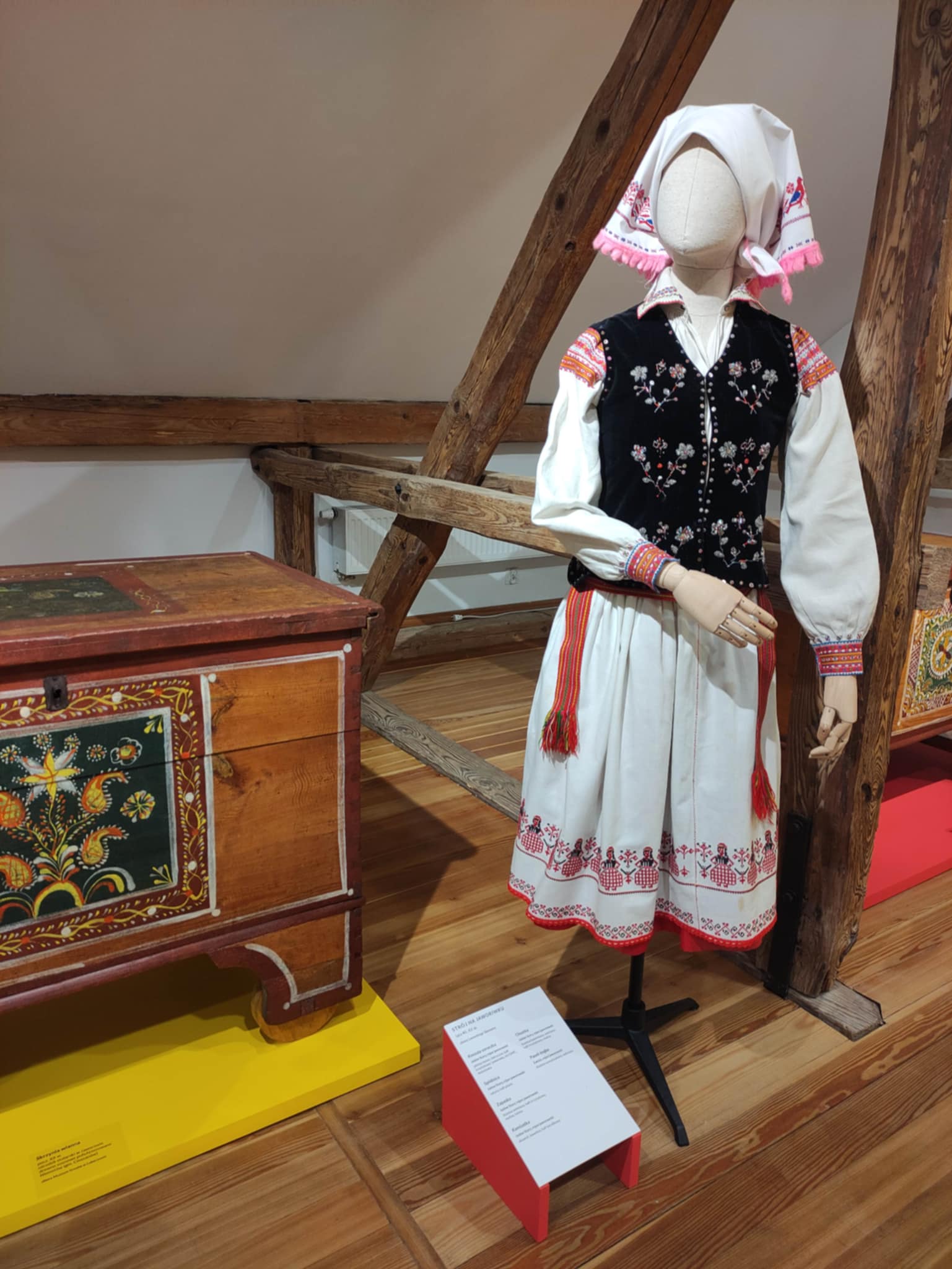 W malowanych skrzyniach przechowywane była odświętna odzież. Na wystawie zaprezentowano prawie sto elementów odzieży kobiecej i męskiej ze zbiorów lwowskiego Skansenu. Reprezentują one przemiany stroju jaworowskiego od końca XIX do połowy XX w. Do najstarszych należą obszerne, haftowane chusty kobiece (tzw. „ubrusy”), drukowane spódnice (tzw. „malowanky”), czy koszule (tzw. „soroczki”) zdobione motywami spiralnymi („na zakretky”). Specyficznym elementem stroju jaworowskiego była również opaska na głowę (tzw. „bawnycia”), na której kobiety zamężne wiązały chustę. Ewolucja stroju ludowego w okolicach Jaworowa polegała na stopniowym wprowadzaniu materiałów fabrycznych. Koszule, kamizelki, kabaty i zapaski nadal jednak zdobione były bogatymi haftami w różnych technikach, które pozostały do dziś charakterystycznym elementem ukraińskiego stroju ludowego.