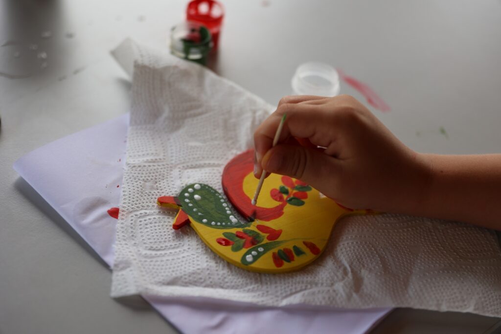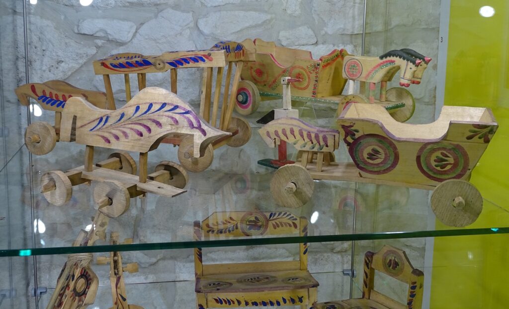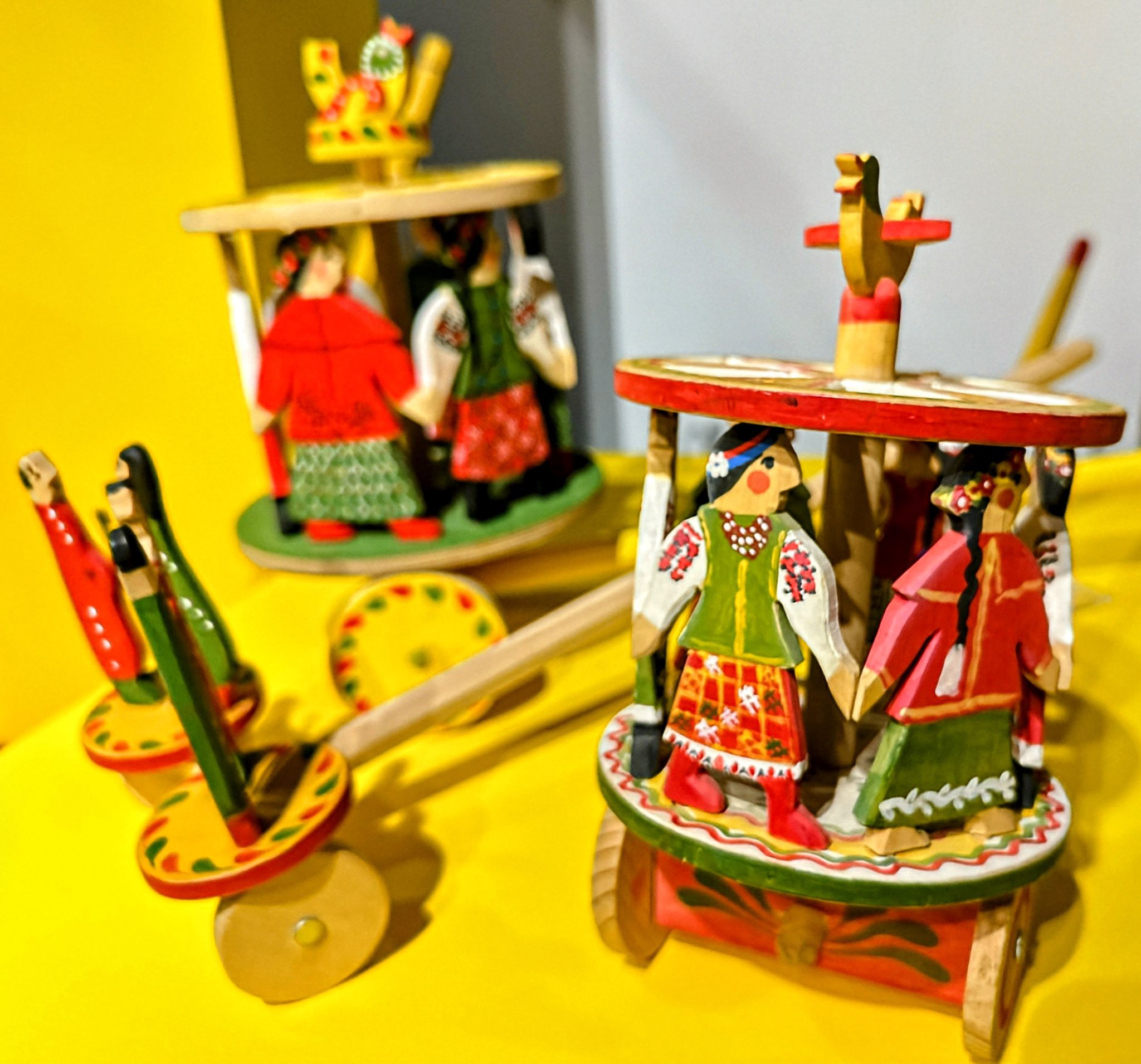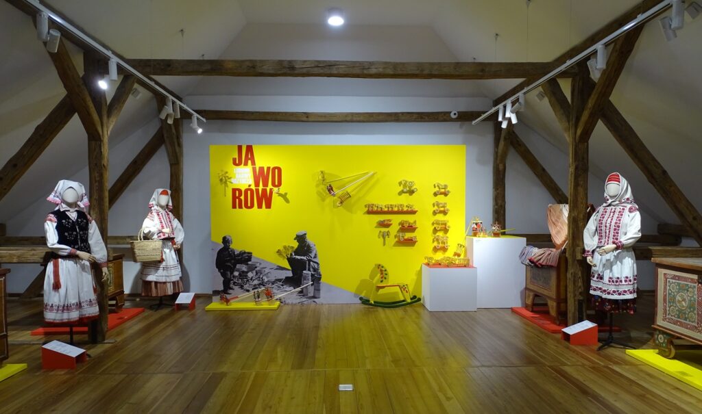 Bogate zdobnictwo strojów i skrzyń posiada swój odpowiednik także w dekoracji jaworowskich zabawek. Ich wytwarzanie posiada odległa tradycje, ale najstarsze zachowane obiekty tego typu pochodzą z początku XX w. Na wystawie zaprezentowano wykonane w tym czasie zabawki jaworowskie ze zbiorów dwóch polskich muzeów – Muzeum Etnograficznego im. Seweryna Udzieli w Krakowie i Muzeum Narodowego Ziemi Przemyskiej w Przemyślu. Dopełniły je współczesne wyroby Ostapa Sojki i Oksany Kohut z Iwano-Frankowego. Twórcy ci podjęli się zadania przywrócenia dawnych tradycji zabawkarskich w regionie jaworowskim. Wykonywane przez nich zabawki w tradycyjnych formach (ptaszki, koniki, kołatki) i kolorach (żółtym, czerwonym i zielonym) zyskały już uznanie i cieszą się dużą popularnością.
