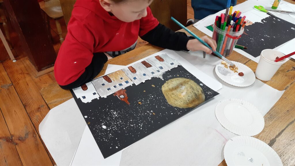 Trzeci dzień Ferii w Muzeum upłynął w klimatach nocnych pejzaży. W oparciu o muzealne zbiory malarstwa, a zwłaszcza obrazy, pochodzącego z Lubaczowa artysty malarza Mariana Kopfa dzieci poznały czym jest nokturn, a następnie tworzyły swój „Lubaczów w blasku księżyca”, baśniowe kompozycje z elementami realnymi i fantastycznymi.