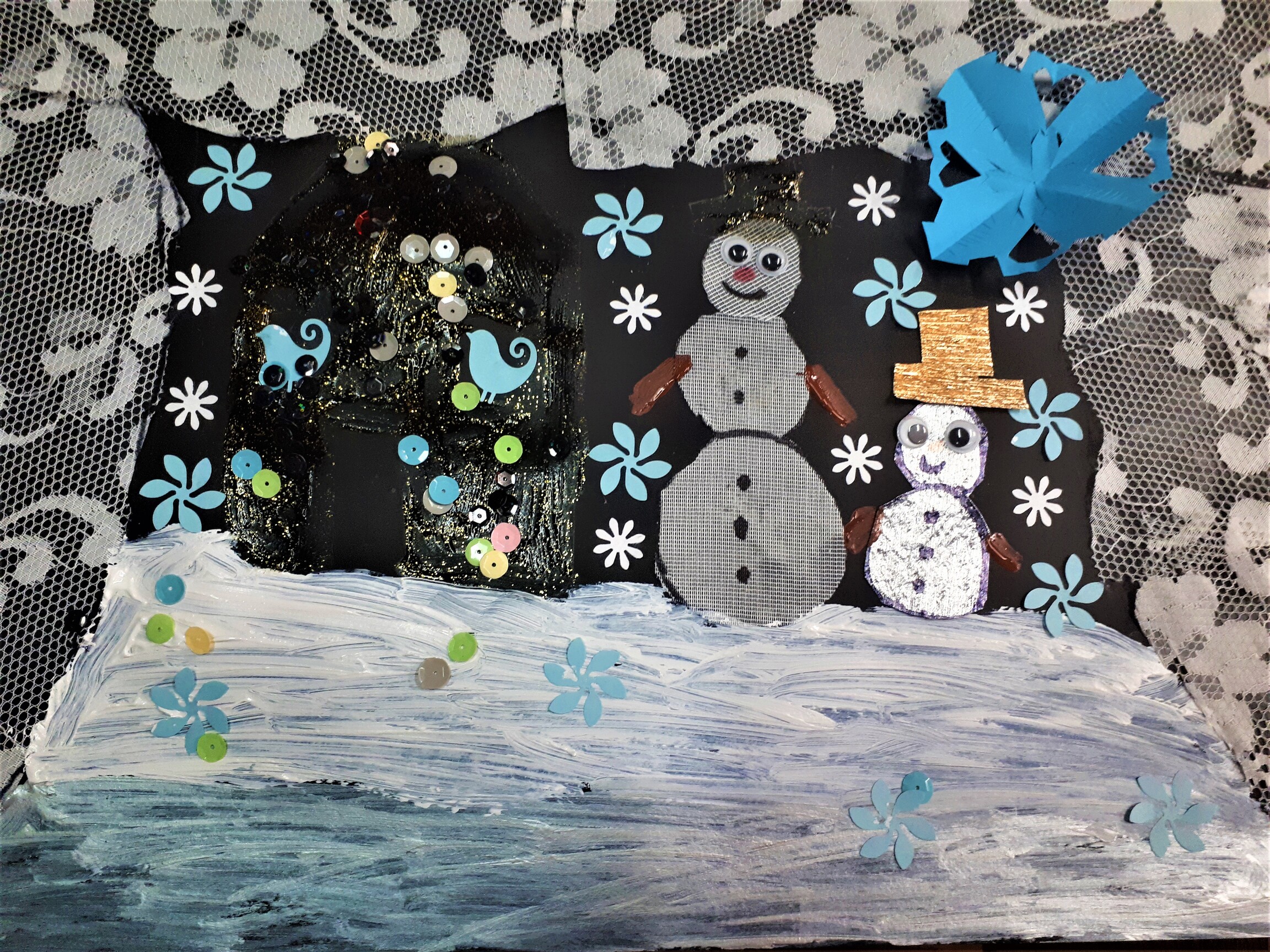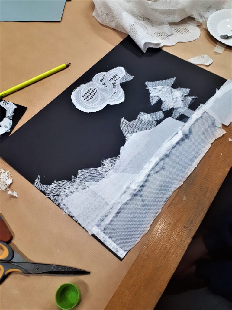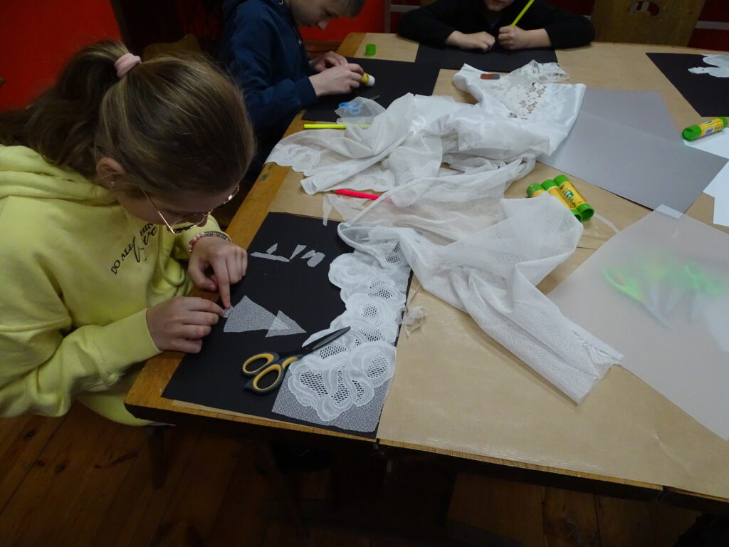 Z kolei w  piątek, w ostatni dzień „Ferii w Muzeum”, z tęsknoty za białą i mroźną zimą tworzyliśmy „Zimowe pejzaże” głównie z koronek i firanek, ale też przy użyciu innych ciekawych materiałów i różnorodnych technik plastycznych.