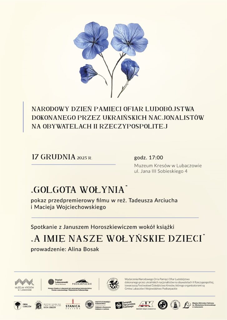 Muzeum Kresów w Lubaczowie serdecznie zaprasza w środę, 17 grudnia 2025 r., o godz. 17, na prapremierę filmu „Golgota Wołynia” w reżyserii Tadeusza Arciucha i Macieja Wojciechowskiego oraz spotkanie autorskie z Januszem Horoszkiewiczem, Kustoszem Pamięci Narodowej, wokół książki „A imię nasze wołyńskie dzieci”, wydanej nakładem własnym autora w 2025 r. Spotkanie w Muzeum Kresów w Lubaczowie poprowadzi Alina Bosak, dziennikarka, autorka książek i animatorka kultury z Wojewódzkiego Domu Kultury w Rzeszowie. Partnerem wydarzenia jest Fundacja Stanica Kresowa. Wstęp wolny. Po spotkaniu możliwość zakupu książki z autografem autora.