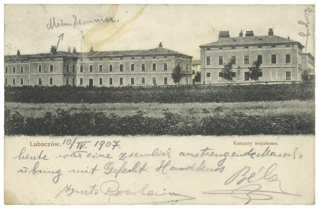 Do tej grupy eksponatów dołączył ostatnio nowy obiekt – karta korespondencyjna z 1907 r., wydana nakładem jednego ze znanych wydawców pocztówek lubaczowskich M.D. Wołoskiego, na której umieszczono widok koszar lubaczowskich im. Franciszka Józefa I, wybudowanych w latach 1885–1887 dla 89. i 90. pułku piechoty armii austro-węgierskiej. W czasie I wojny światowej kompleks koszar stanowił ważny punkt mobilizacyjny; znajdował się tam również wojskowy lazaret. W 1918 r. kompleks koszarowy odegrał ważną rolę podczas walk polsko-ukraińskich o Lubaczów, toczonych równolegle ze zmaganiami o Lwów i Przemyśl. Tu formowała się tzw. kompania lubaczowska pod dowództwem por. Stanisława Dąbka, która w oparciu o umocnienia koszarowe odparła atak wojsk ukraińskich. W okresie międzywojennym koszary nosiły imię gen. Józefa Zajączka. Stacjonował tu batalion 39. pp Strzelców Lwowskich. Obecnie większość budynków po dawnej zabudowie koszarowej zajmuje Zespół Placówek im. Jana Pawła II.