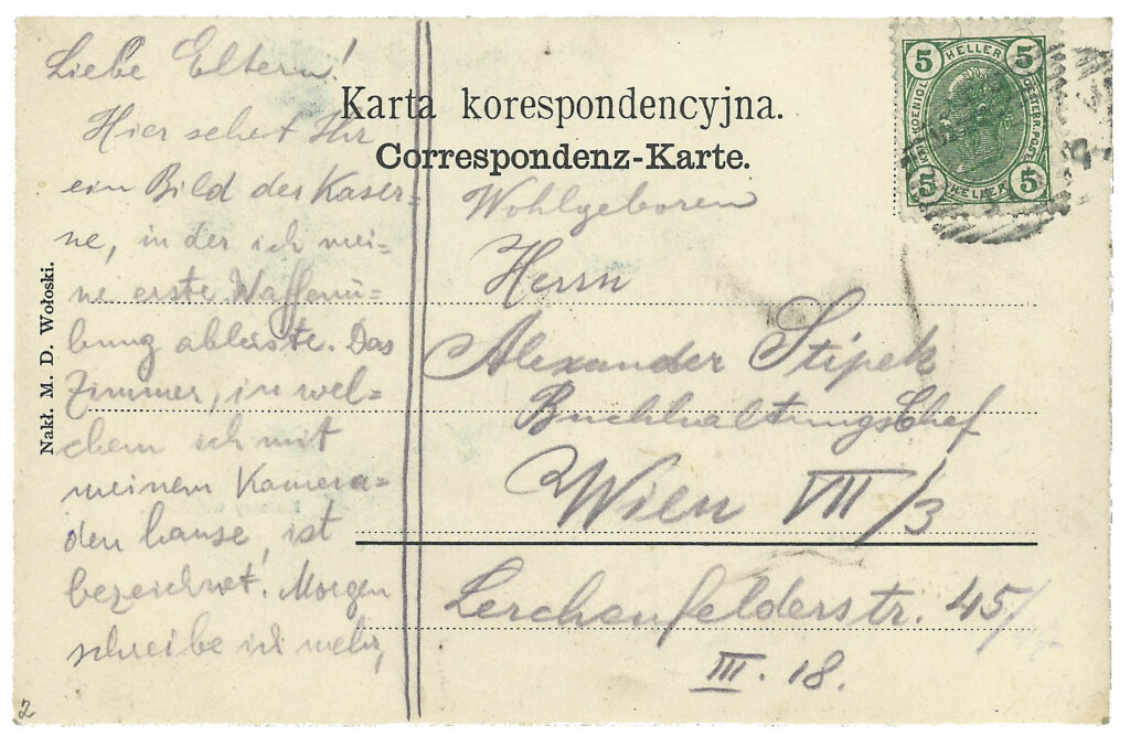 Na rewersie, w miejscu na wpisanie adresata, widnieją dane Aleksandra Stipka oraz jego adres zamieszkania we Wiedniu. Warto odnotować, że w koszarach lubaczowskich tego okresu stacjonowali żołnierze różnych narodowości, co wynikało z rozległości terytorium, jakie obejmowała swą jurysdykcją monarchia austro-węgierska. Z tego względu na pocztówki z przełomu XIX i XX w. z Lubaczowa można dzisiaj natrafić między innymi w antykwariatach w Pradze czy, jak w tym przypadku, we Wiedniu.