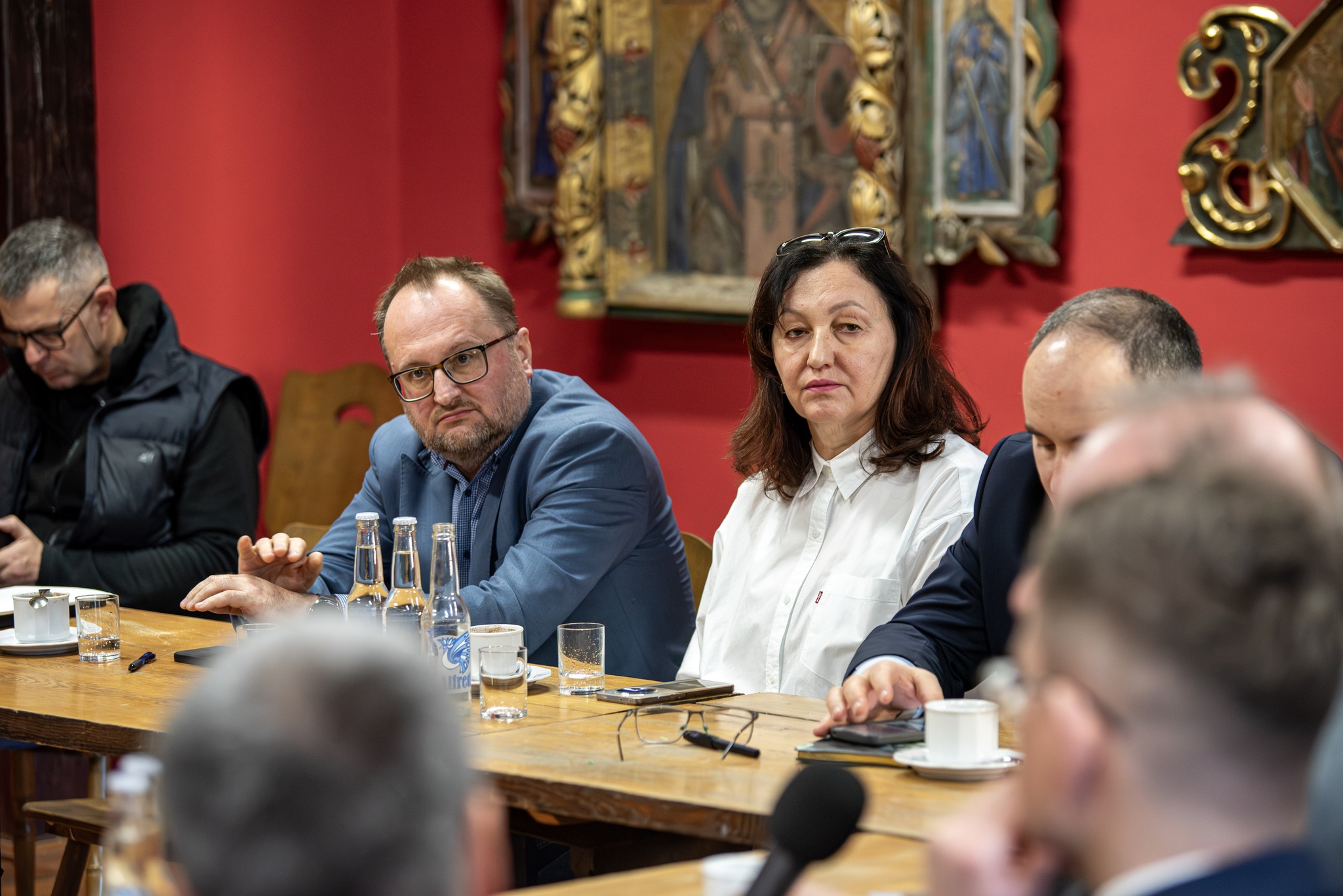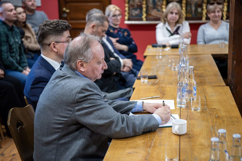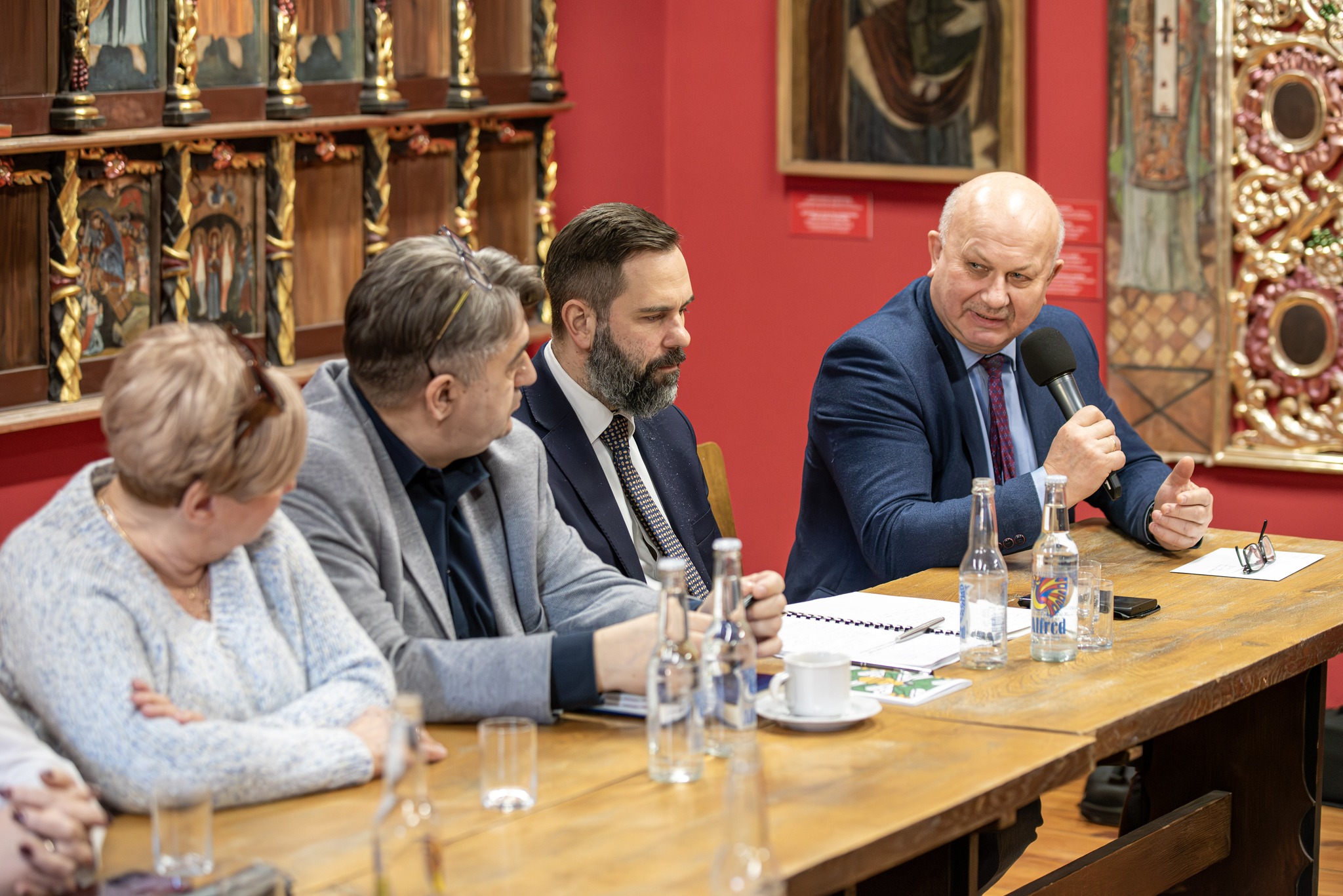 W dalszej części spotkania Waldemar Rataj, wiceprzewodniczący Rady Muzeum, podkreślił potrzebę wypracowania długofalowej wizji funkcjonowania placówki. Zwrócił uwagę na konieczność zabezpieczenia środków na modernizację głównego gmachu oraz opracowanie spójnej strategii rozwoju, adekwatnej do znaczenia muzeum. Centralnym wątkiem jego wystąpienia była relacja między dziedzictwem lokalnym, a dziedzictwem Kresów dawnej Rzeczypospolitej. Dyrektor Rataj zaznaczył, że nie należy ich traktować jako konkurencyjnych, lecz jako uzupełniające się obszary działalności. Wymaga to jednak ich doprecyzowania, zwłaszcza że pojęcie „Kresów”, wprowadzone przez Wincentego Pola, pozostaje niejednoznaczne i bywa różnie interpretowane, co może prowadzić do napięć. Podkreślił również znaczenie dialogu między samorządem lokalnym, a władzami województwa, wskazując, że muzeum pełni nie tylko funkcję regionalną, ale także uczestniczy w kształtowaniu pamięci o Kresach, wpisując się w szerszą politykę pamięci województwa podkarpackiego. Zwrócił uwagę, że lokalna społeczność naturalnie silniej identyfikuje się z własną historią, dlatego kluczowe jest wypracowanie modelu, który pozwoli łączyć oba wymiary bez konfliktów. Jako uzasadnienie kresowego charakteru muzeum wskazał m.in. związki regionu z dawną archidiecezją lwowską oraz dziedzictwo Radruża jako ważne świadectwo wielokulturowości dawnej Rzeczypospolitej. W jego ocenie przyszłość muzeum powinna opierać się na spójnej koncepcji łączenia dziedzictwa lokalnego i kresowego, wypracowanej w dialogu ze społecznością i instytucjami samorządowymi.