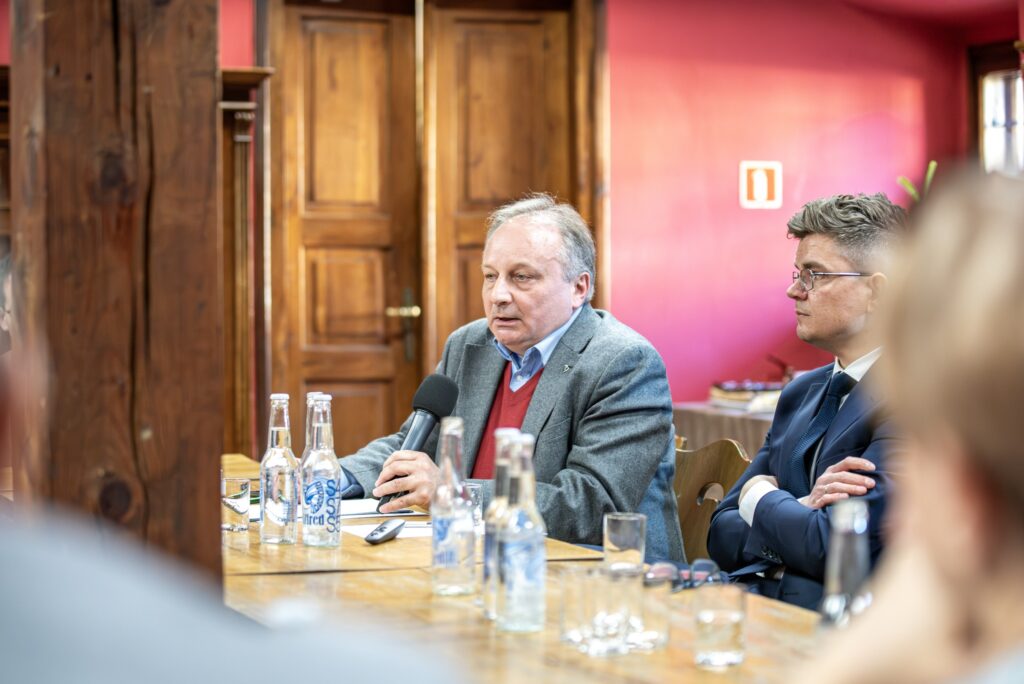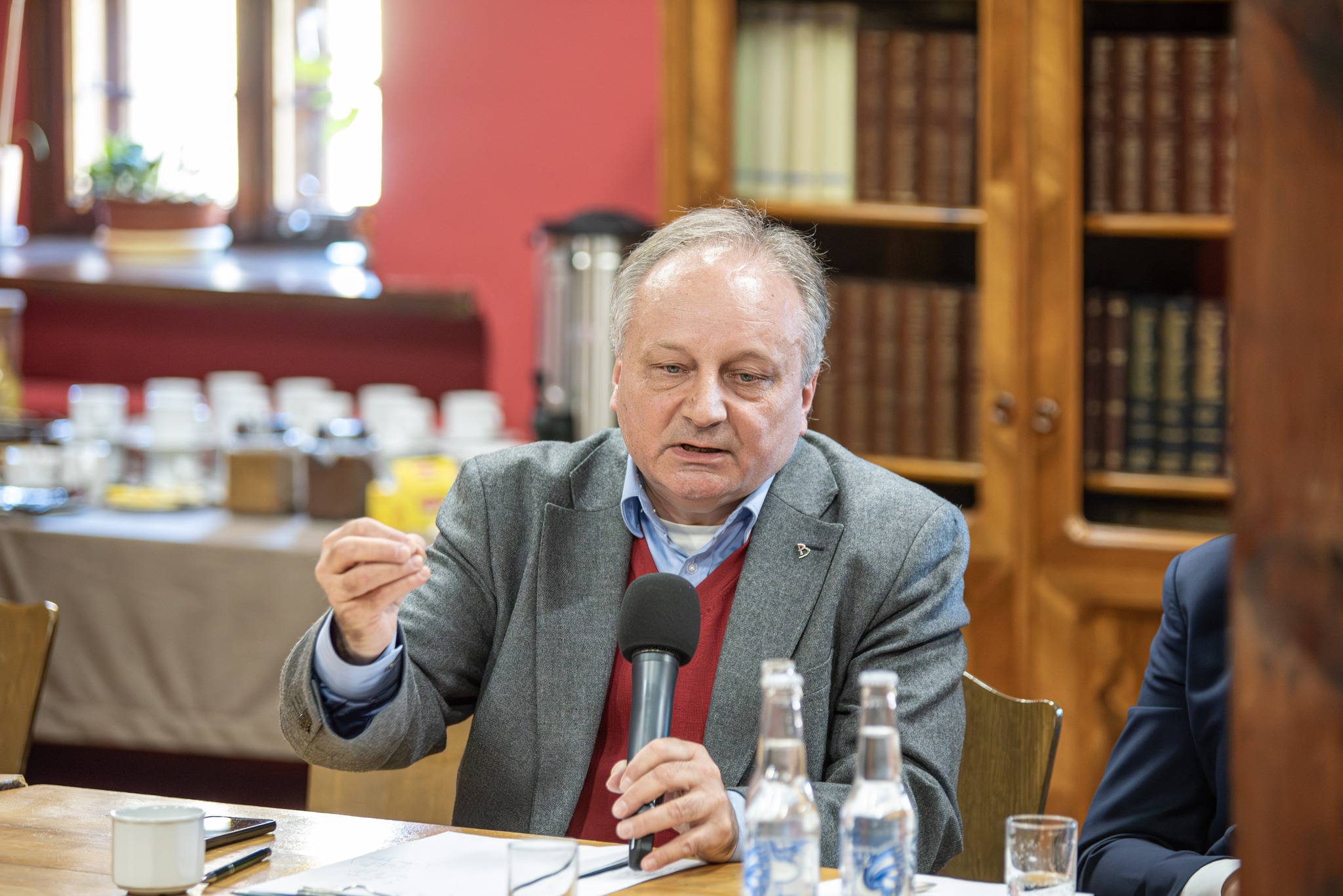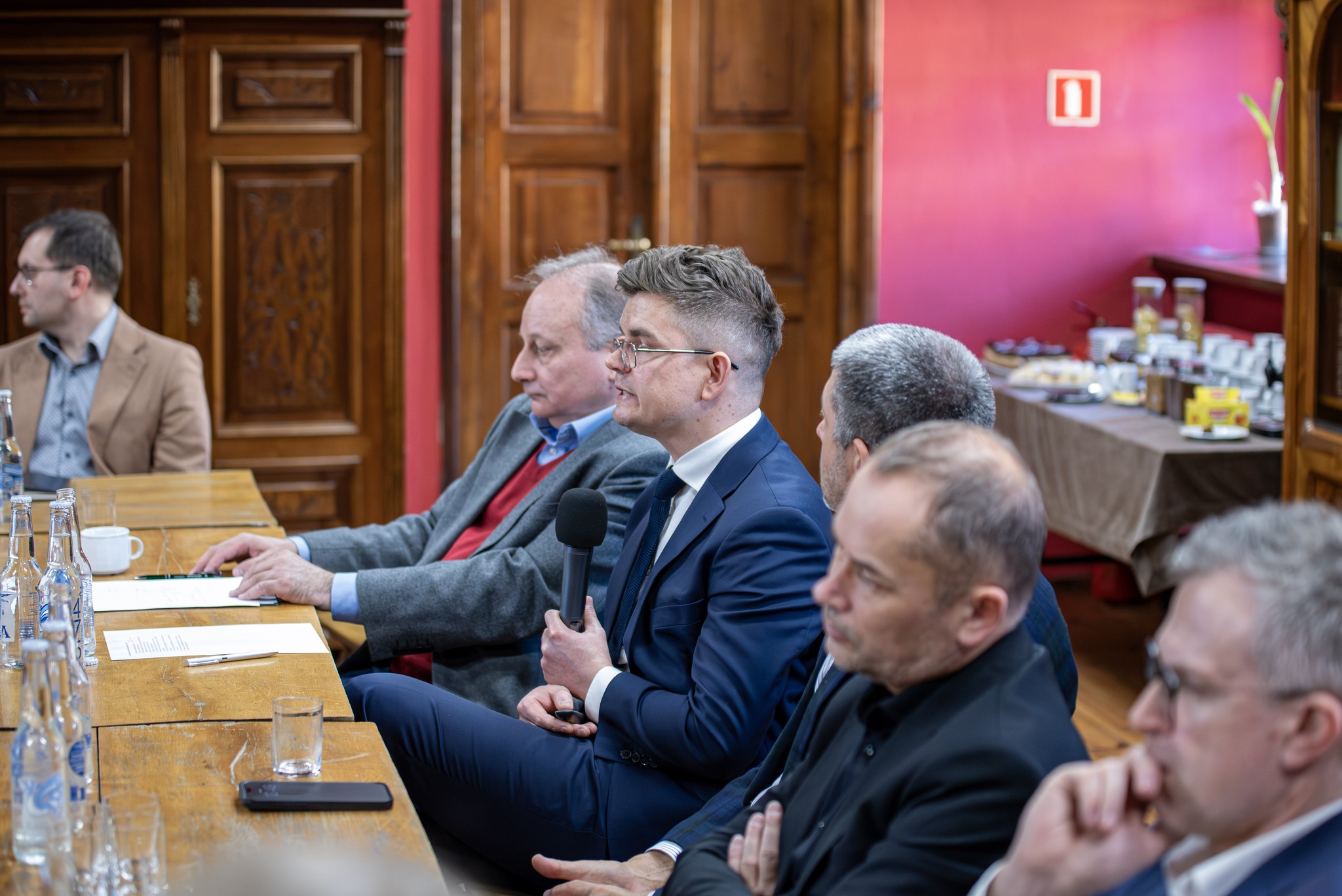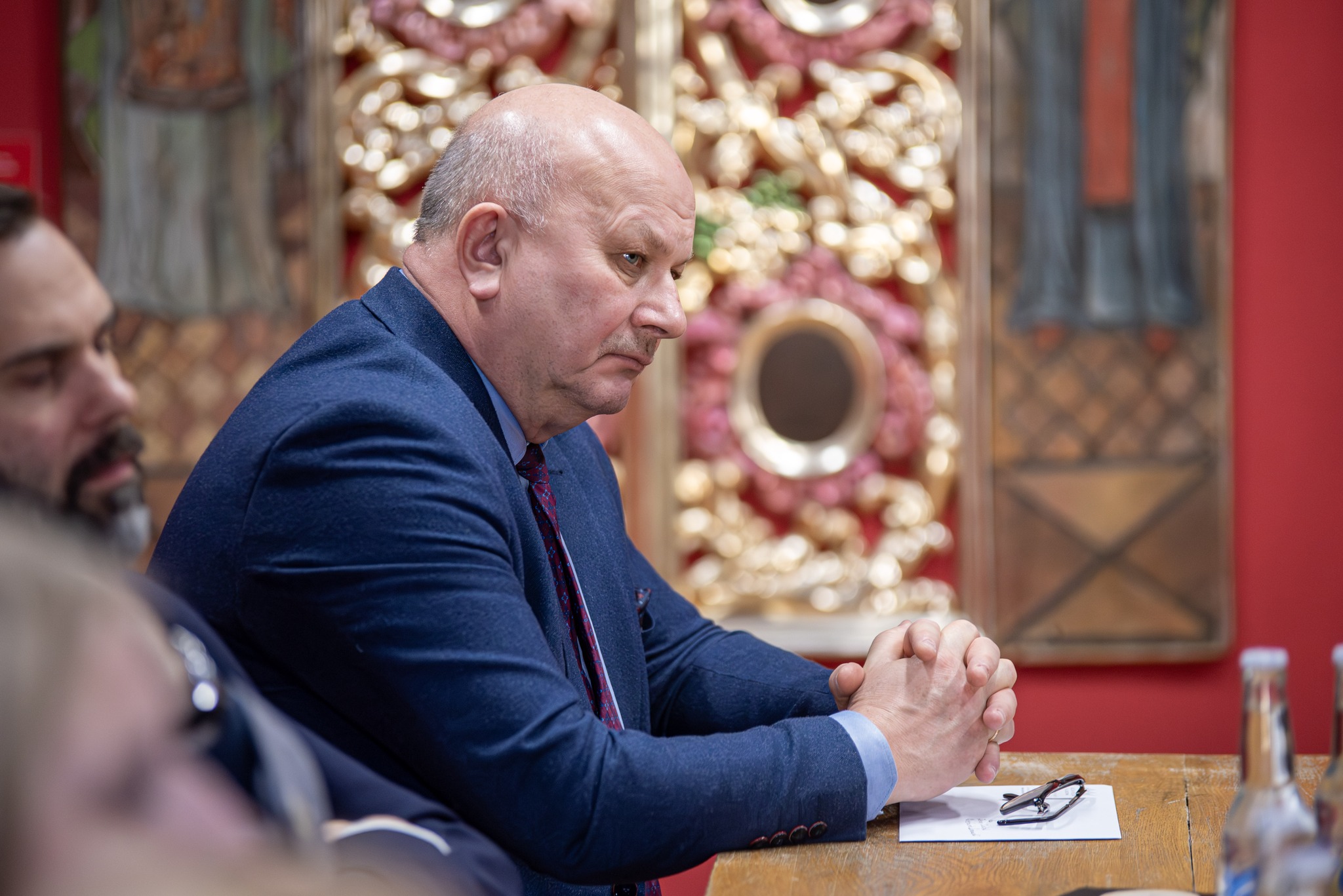 W dalszej części spotkania Waldemar Rataj, wiceprzewodniczący Rady Muzeum, podkreślił potrzebę wypracowania długofalowej wizji funkcjonowania placówki. Zwrócił uwagę na konieczność zabezpieczenia środków na modernizację głównego gmachu oraz opracowanie spójnej strategii rozwoju, adekwatnej do znaczenia muzeum. Centralnym wątkiem jego wystąpienia była relacja między dziedzictwem lokalnym, a dziedzictwem Kresów dawnej Rzeczypospolitej. Dyrektor Rataj zaznaczył, że nie należy ich traktować jako konkurencyjnych, lecz jako uzupełniające się obszary działalności. Wymaga to jednak ich doprecyzowania, zwłaszcza że pojęcie „Kresów”, wprowadzone przez Wincentego Pola, pozostaje niejednoznaczne i bywa różnie interpretowane, co może prowadzić do napięć. Podkreślił również znaczenie dialogu między samorządem lokalnym, a władzami województwa, wskazując, że muzeum pełni nie tylko funkcję regionalną, ale także uczestniczy w kształtowaniu pamięci o Kresach, wpisując się w szerszą politykę pamięci województwa podkarpackiego. Zwrócił uwagę, że lokalna społeczność naturalnie silniej identyfikuje się z własną historią, dlatego kluczowe jest wypracowanie modelu, który pozwoli łączyć oba wymiary bez konfliktów. Jako uzasadnienie kresowego charakteru muzeum wskazał m.in. związki regionu z dawną archidiecezją lwowską oraz dziedzictwo Radruża jako ważne świadectwo wielokulturowości dawnej Rzeczypospolitej. W jego ocenie przyszłość muzeum powinna opierać się na spójnej koncepcji łączenia dziedzictwa lokalnego i kresowego, wypracowanej w dialogu ze społecznością i instytucjami samorządowymi.