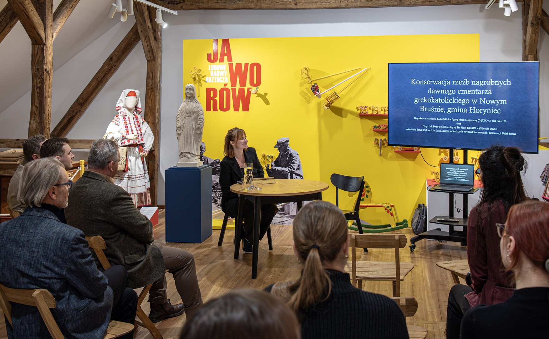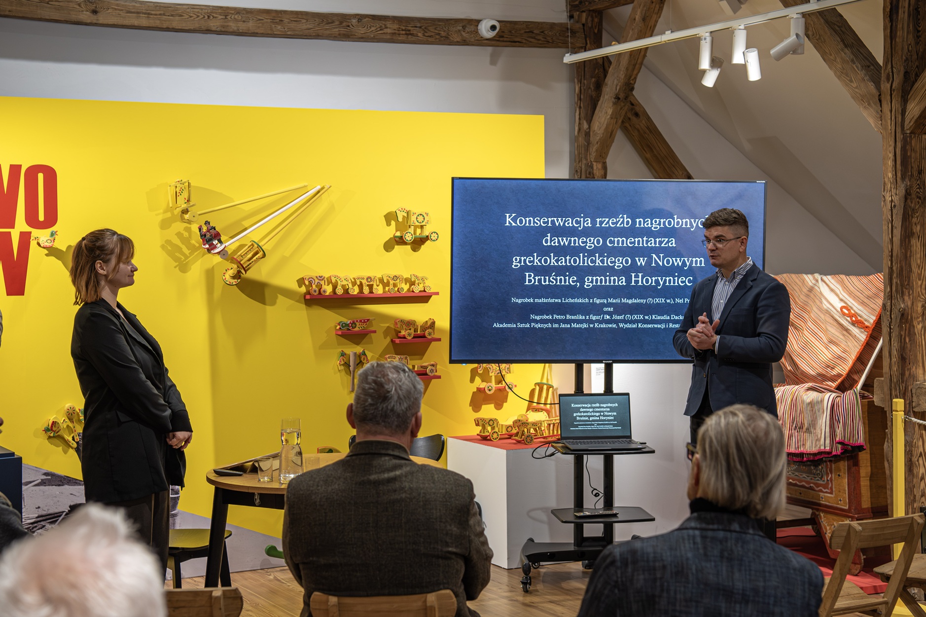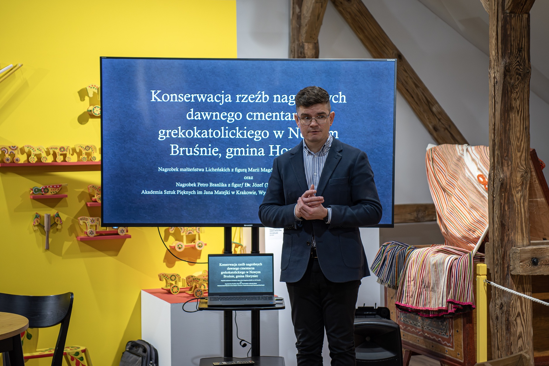 Klaudia Dacko w czasie listopadowego seminarium miała okazję po raz pierwszy zobaczyć odnowiony przez siebie nagrobek z rzeźbą św. Józefa w jego naturalnym środowisku. W przygotowanej prezentacji opowiedziała też o problemach, z jakimi obydwie młode konserwatorki spotkały się w czasie prac przy tych dwóch niezwykłych dziełach. O wyzwaniach, jakie niesie konserwacja rzeźby bruśnieńskiej, opowiedziała również w swym wystąpieniu Joanna Głaz, która pod względem praktycznym i naukowym specjalizuje się w tym zagadnieniu. Zainicjowana przed trzema laty współpraca lubaczowskiego muzeum i słynnej krakowskiej uczelni dobrze rokuje na przyszłość. W tym roku kolejne trzy nagrobki (Anny Wasznianin, zm. 1937 r., Iwana Wasznianina, zm. 1928 r. oraz Ewy Liwczanin, zm. 1932 r.) z cmentarza noworuśnieńskiego trafiły do pracowni na ASP w Krakowie.