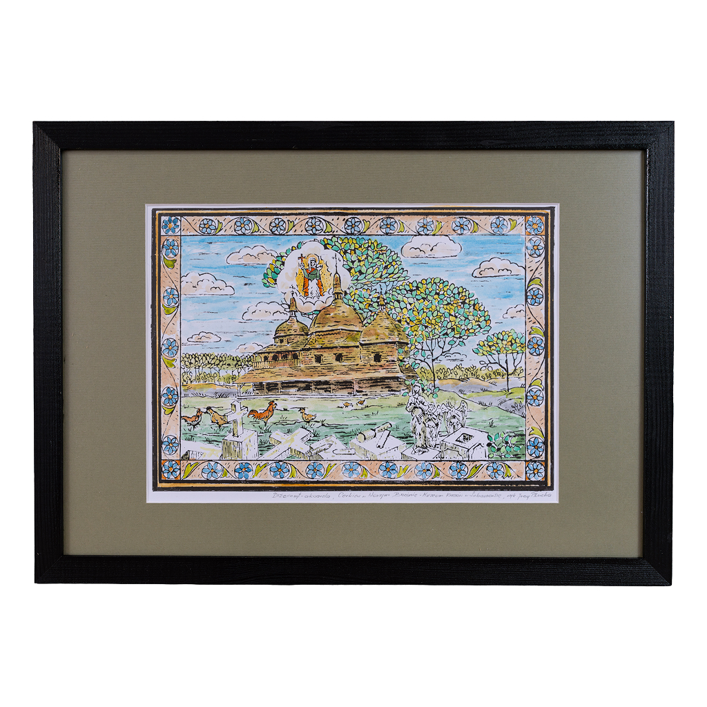Odbitka drzeworytnicza, kolorowana, autorstwa znanego lubaczowskiego artysty, a także konserwatora dzieł sztuki w Muzeum Kresów w Lubaczowie, Jerzego Pluchy, o wymiarach 29 x 21 cm. Odbitka drzeworytnicza z passe-partout, w drewnianej czarnej oprawie.