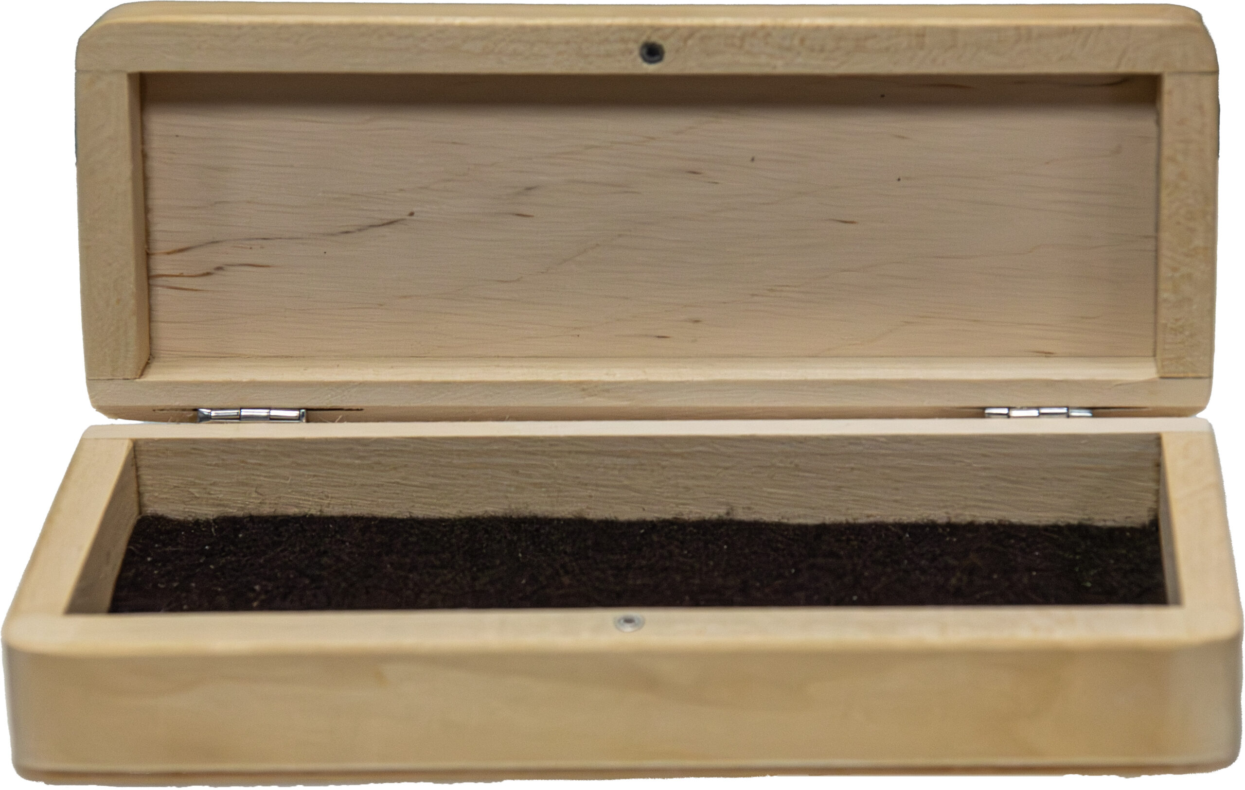 Piórnik drewniany z otwieranym wieczkiem z logo Muzeum Kresów w Lubaczowie.