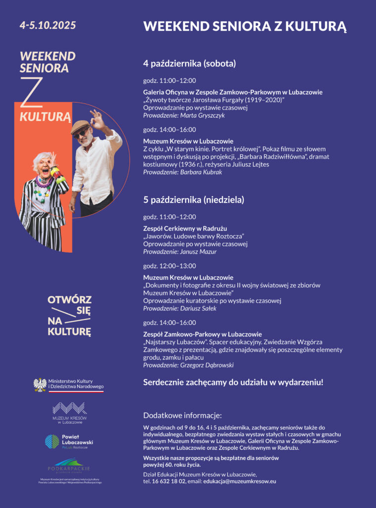 W październikowy weekend 4 i 5 października 2025 r. po raz kolejny w całej Polsce odbędzie się „Weekend Seniora z kulturą” – akcja prowadzona przez Ministerstwo Kultury i Dziedzictwa Narodowego, której celem jest zachęcenie seniorów do aktywnego uczestnictwa w życiu kulturalnym.
