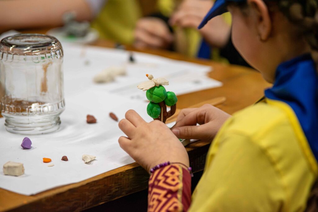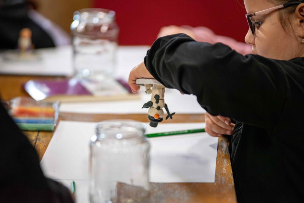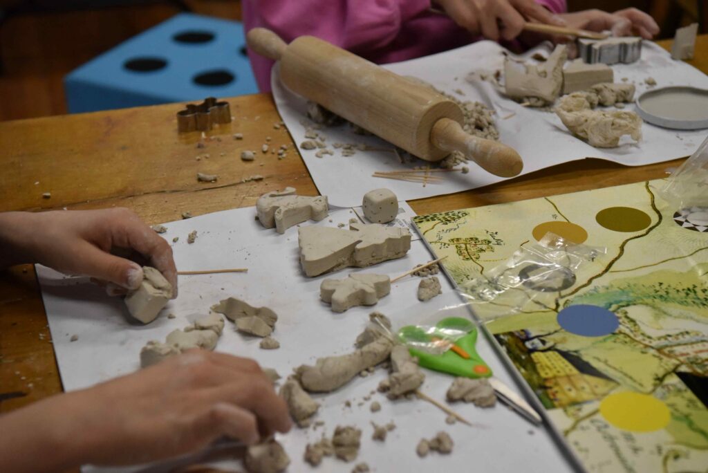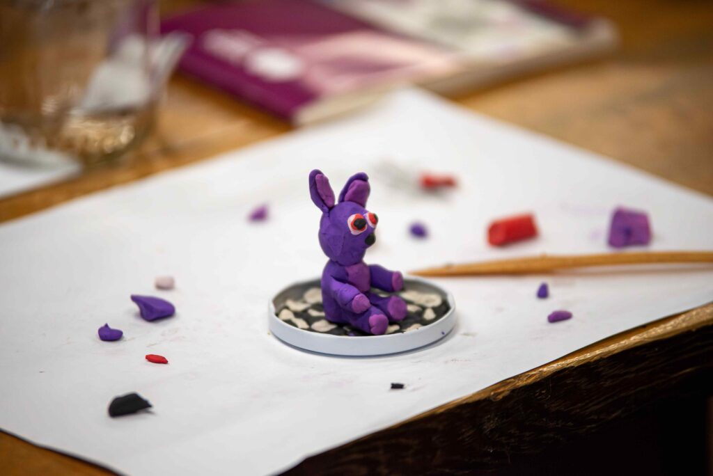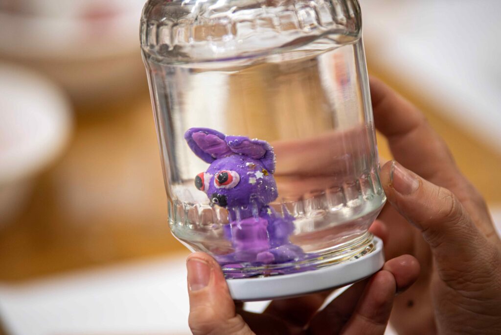Innym razem po obejrzeniu wystawy czasowej wybitnego i pochodzącego z Lubaczowa ludowego rzeźbiarza Jarosława Furgały (1919-2020) oraz po zapoznaniu się z warsztatem artysty dzieci tworzyły rzeźby z plasteliny: postaci, zwierzęta i różne scenki rodzajowe. Kolorowe kompozycje trafiły do magicznej szklanej kuli z gwiezdnymi dukatami. Dzieci były zauroczone spektaklem wirujących gwiazd.