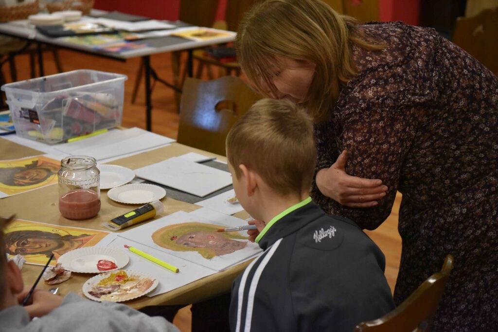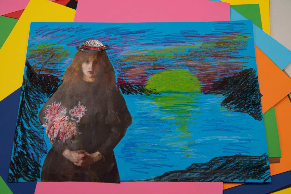Drugi tydzień „Ferii w muzeum” rozpoczęliśmy spotkaniem z twórczością wybitnej polskiej malarki – Olgi Boznańskiej. Poruszeni dziełami artystki, zwłaszcza jej psychologicznymi portretami wspólnie tworzyliśmy pełne emocji prace – kolaże, łącząc różne techniki i materiały. Zajęcia wprowadzały w fascynujący świat portretu oraz zwracały uwagę, jak dostrzegać i wyrażać emocje w sztuce.