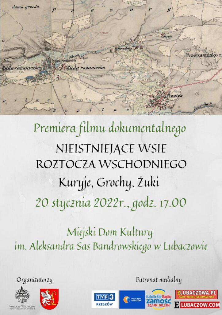 W czwartek, 20 stycznia 2022 r., o godz. 17.00, w Kinie „Melodia” przy Miejskim Domu Kultury w Lubaczowie odbędzie się premiera filmu dokumentalnego „Nieistniejące wsie Roztocza Wschodniego – Grochy, Kuryje, Żuki”, którego producentem jest Stowarzyszenie Geoturystyczne „Roztocze Wschodnie” z Lubaczowa. W tym samym dniu o godz. 18.00 film będzie miał swoją premierę online na profilu facebookowym Stowarzyszenia Geoturystycznego „Roztocze Wschodnie” oraz Muzeum Kresów w Lubaczowie. Jesteśmy partnerem merytorycznym tej produkcji.